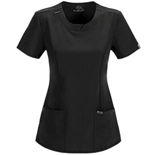 A round neck top with rib inset front neckband features shoulder yokes, a bungee I.D. badge loop on the right shoulder, front and back princess seams, two patch pockets, one interior pocket, and side vents. Stretch rib knit at the center back panel gives this top its slimming shape and allows for extra movement and comfort. Cover-stitch detail throughout. Center back length: 26″ 95% Polyester / 5% Spandex Poplin